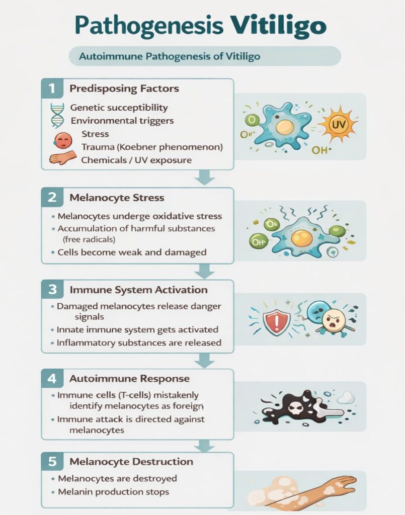Nowadays, vitiligo has become very common as we see many people having it . But still, the exact cause or its origin is not known. But not to worry because various theories have been proposed to understand how it occurs. Vitiligo is an acquired autoimmune condition, which means that our own body is destroying our melanocytes due to various reasons. Let me put it in a flowchart manner for better understanding.