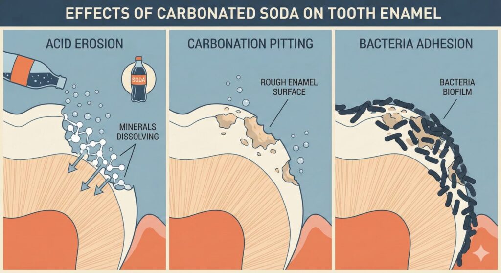 Carbonated water has been shown to soften enamel more than still water. Sugar-free soft drinks can roughen dentin surfaces and encourage bacterial adhesion. Repeated acidity weakens the tooth surface even if sugar never enters the picture.