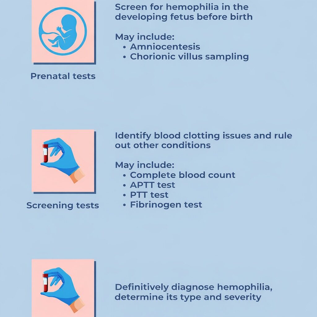 Prenatal diagnosis in hemophilia involves specialized tests offered to families at risk of passing on the condition. These tests can confirm early in pregnancy whether their child (developing fetus) may or may not be affected, allowing parents to make informed decisions about whether or not to continue the pregnancy. The results can also help healthcare professionals plan the safest method and location for delivery. Discussing prenatal diagnosis before becoming pregnant is recommended, so individuals fully understand their options. This early discussion supports informed family planning and preparedness.