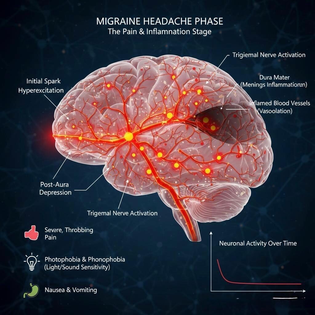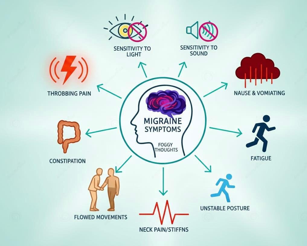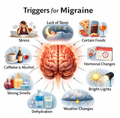 Migraine is more than a headache—it is a deeply personal struggle that can disrupt work, sleep, and everyday moments. For many individuals, a migraine attack is not limited to head pain alone but is accompanied by nausea, sensory sensitivity, mental fog, and exhaustion, making it a whole-body experience rather than a single symptom which makes the person vulnerable and weak .Behind the pain lies a complex interplay of overactive nerves, chemical signals, and brain sensitization together create a state where normal stimuli such as light, sound, or movement become overwhelming. By understanding these mechanisms and addressing triggers early, identifying personal triggers, recognizing warning signs, and applying preventive strategies can significantly reduce the frequency and severity of attacks., we can guide patients toward effective treatments, helping them regain control, restore balance, and reclaim the life that migraine has taken from them.
