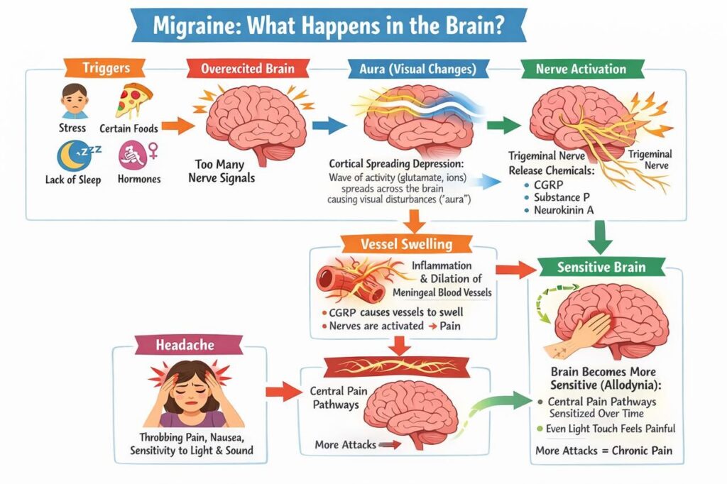 Did you have a headache which felt like your brain is thumping like your heart inside your skull, lights feel like needles, and the slightest sound feels painful? That’s migraine—a condition that’s more than just pain; it is a rollercoaster ride in your brain of the brain’s hidden signals, chemical messengers. It’s our brain barin sending us an SOS. Let’s together unravel the mystery behind this.