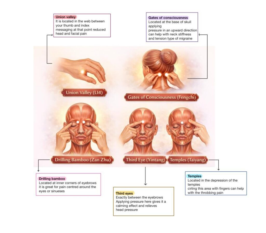 Migraines can be relieved using various medications and lifestyle management. Certain pressure points used in Acupressure can reduce the intensity of migraine and the frequency. They are located mainly in muscle and rich nerve supply areas such as head,face,neck and hands. Applying uniform and gentle pressure at these various points can reduce the intensity, help in muscle relaxation and regulate the pain signals going to the brain. These pressure points only help in the management of the migraine; it is not a cure for it to help in relief and reduce stress.