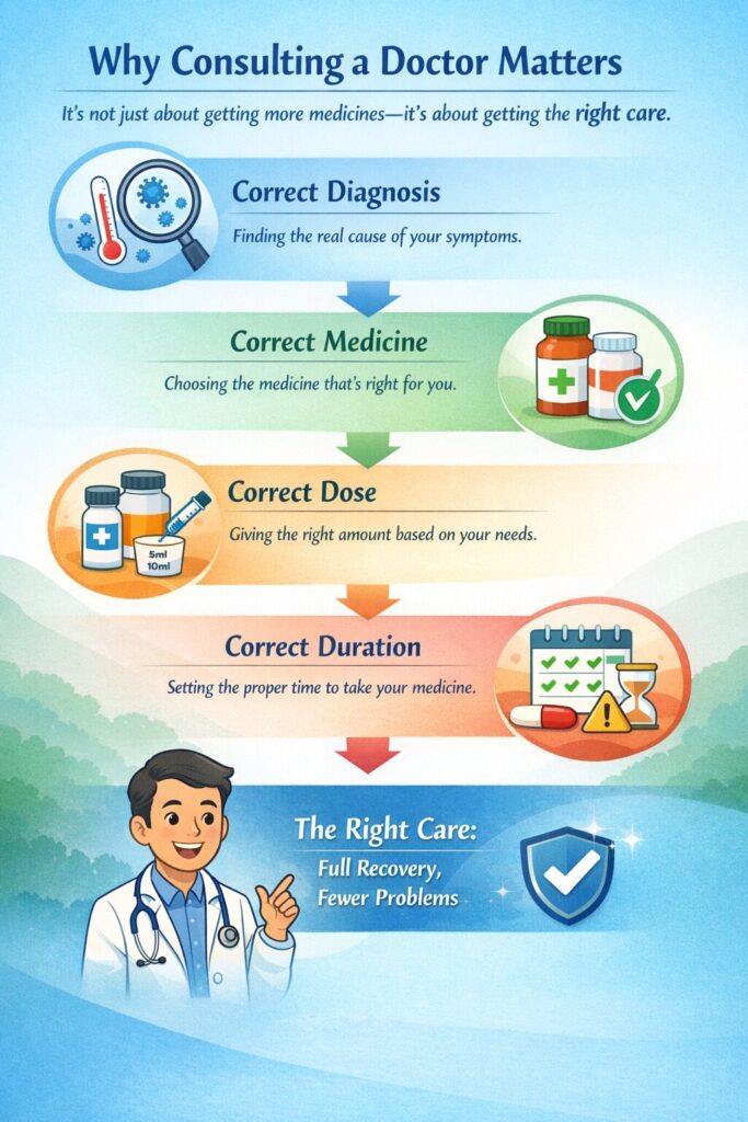 Correct diagnosis: Many illnesses have similar symptoms like fever, cough, pain and lethargy. A doctor’s examination helps identify the real cause, so treatment is not based on guesswork.