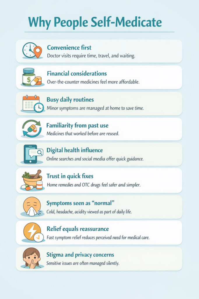 In recent times, digital influence has added a new layer. Online searches, social media, and health apps give instant information, but not always accurate advice, leading to self-treatment.