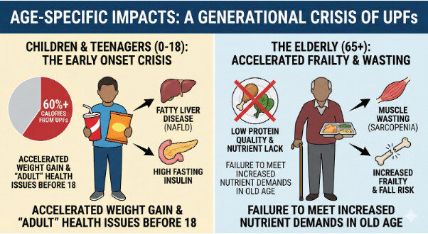 The impact of UPFs is most profound at the polar ends of the lifespan, with particularly alarming trends in the youth, creating a generational crisis. For children and teenagers, who often get more than 60% of their total calories from these products, early exposure is fueling accelerated weight gain and causing “adult” health issues like high fasting insulin and fatty liver disease to appear before the age of 18. Meanwhile, for the elderly, a high UPF intake is a major contributor to muscle wasting and frailty because the low protein quality and sheer lack of essential nutrients fail to meet the body’s increasing demands in old age.