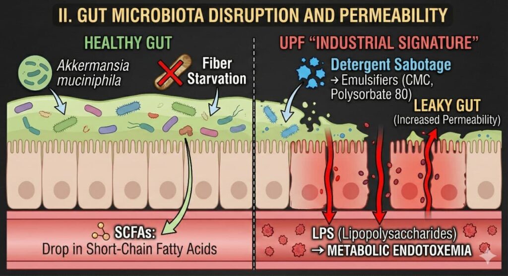 The Detergent Sabotage (The Emulsifier Effect): Common additives like Carboxymethylcellulose (CMC) and Polysorbate 80 act like miniature detergents, dissolving the crucial protective mucus layer in your gut. This leads to “Leaky Gut” (increased intestinal permeability), allowing bacterial toxins (Lipopolysaccharides or LPS) to flood your bloodstream and ignite metabolic endotoxemia.