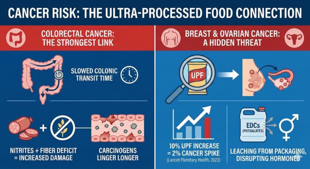 Breast and Ovarian Cancer: A Hidden Threat. Groundbreaking research published in The Lancet Planetary Health (2023) has revealed a chilling statistic: for every 10% increase in Ultra-Processed Food (UPF) consumption, there is a measurable 2% spike in overall cancer incidence. This risk is acutely focused on female-specific cancers. The suspected culprit is not the food itself, but what comes with it: Endocrine-Disrupting Chemicals (EDCs) like phthalates, which leach out of the plastic packaging directly into the food.