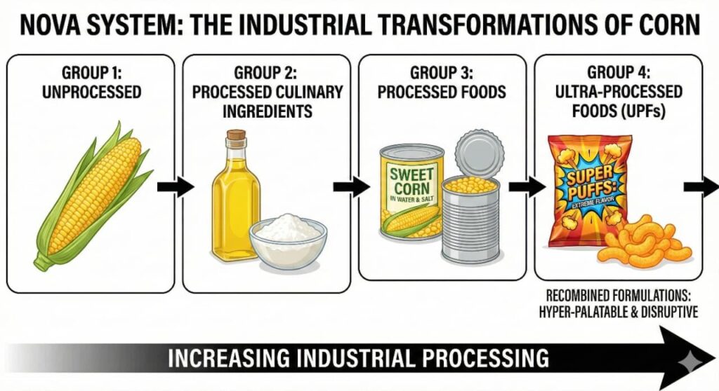 Forget old food pyramids. Developed by researchers at the University of São Paulo, the NOVA system is the essential new framework ,the gold standard for exposing the dangers of Ultra-Processed Foods (UPFs). It cuts through the marketing to categorize all foods into four distinct groups based entirely on the extent and purpose of their industrial makeover.
