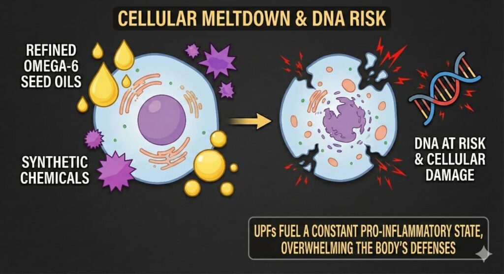 - Cellular Meltdown (Oxidative Stress): Overloads of refined omega-6 seed oils and synthetic chemicals overwhelm your body’s natural defenses, causing cellular damage and putting your very DNA at risk.