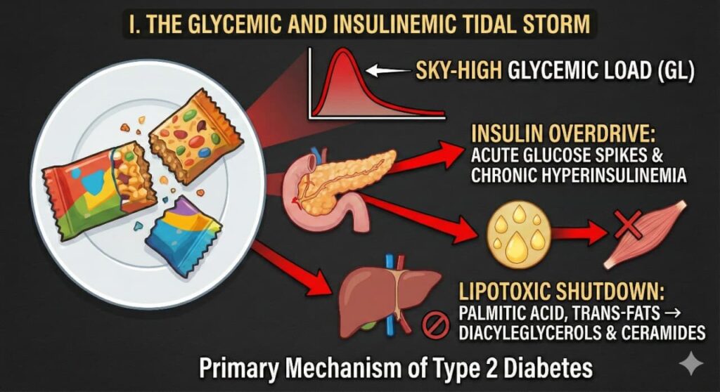 Lipotoxic Shutdown: UPFs are saturated with culprits like palmitic acid and trans-fats. When you overload your system, these lipid byproducts (diacylglycerols and ceramides) flood critical areas like the liver and muscle, directly slamming the door on peripheral insulin sensitivity, this being the primary mechanism of type 2 diabetes.