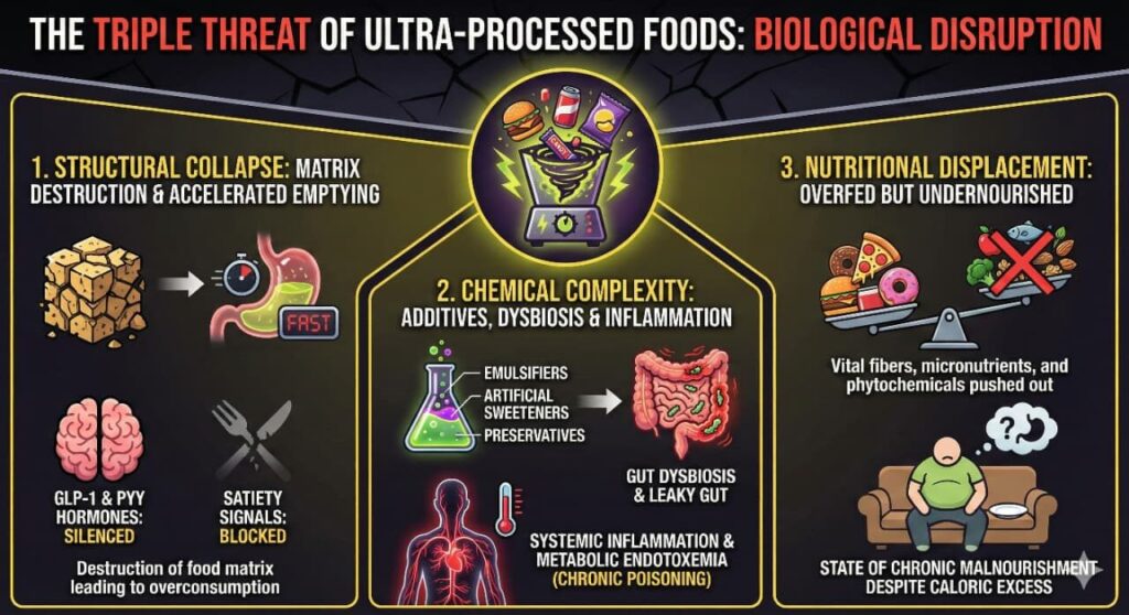 The threat of Ultra-Processed Foods (UPFs) is rooted in a “triple threat” of biological disruption.