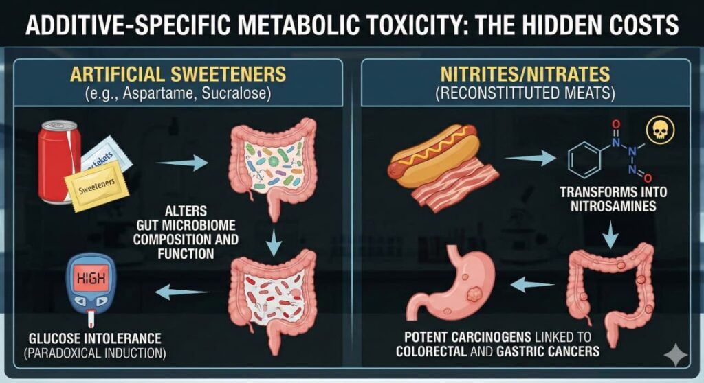 - Nitrites/Nitrates: Common in reconstituted meats, these can transform into nitrosamineswhich are potent carcinogens linked to colorectal and gastric cancers.