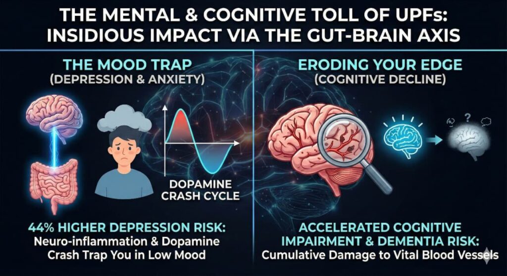 The Mood Trap (Depression & Anxiety): Diets rich in UPFs carry a staggering 44% higher risk of depression. Think of this as a double-whammy: it’s not just the neuro-inflammation fueled by an unbalanced gut, but also the inevitable “dopamine crash” that follows the fleeting rush of these hyper-palatable foods, trapping you in a cycle of low mood.