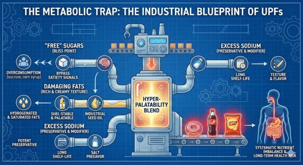 Ultra-Processed Foods (UPFs) are not just “fast food” they are metabolic traps. Their composition is a deliberate industrial blueprint, meticulously crafted to maximize profit and shelf-life, often at the direct expense of your long-term health. This manufacturing process creates a systematic, dangerous nutrient imbalance: