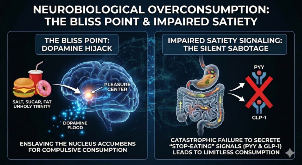 Impaired Satiety Signaling: The Silent Sabotage: As a consequence of the “Matrix Effect,” the rapid, almost instantaneous transit of these fabricated foods races past the gut’s internal sentinels. This prevents the distal small intestine from ever registering the nutrients, resulting in a catastrophic failure to secrete the critical hormones PYY and GLP-1. The body’s crucial “stop-eating” signal is not just suppressed; it is utterly silenced, leaving the gates wide open for limitless consumption.