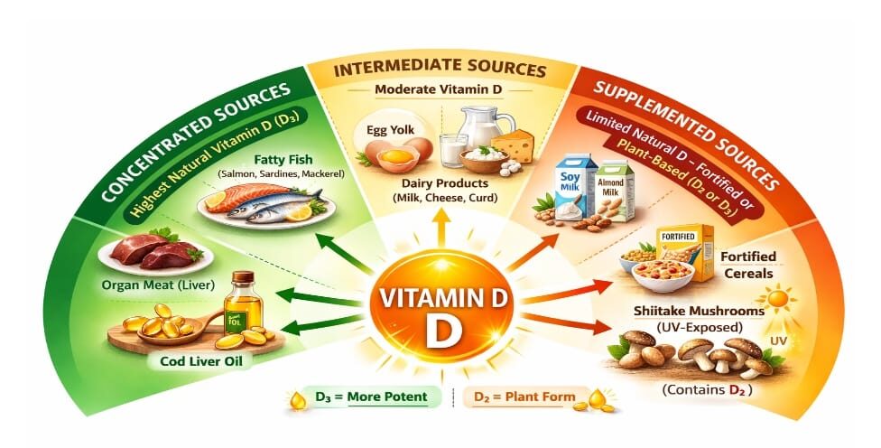 As it’s clear that exposure to sunlight is highly inconsistent, Dietary vitamin D is the only source for most people. However, this is still an issue for vegetarians and vegans, as richest sources are mostly animal-derived. These include fatty fishes (such as salmon, mackerels and sardines), cod liver oil, egg yolk and dairy products. Vegetarian sources are largely limited to fortified foods like cereals, soy milk, almond milk, UV – B exposed mushrooms (shitake), etc.