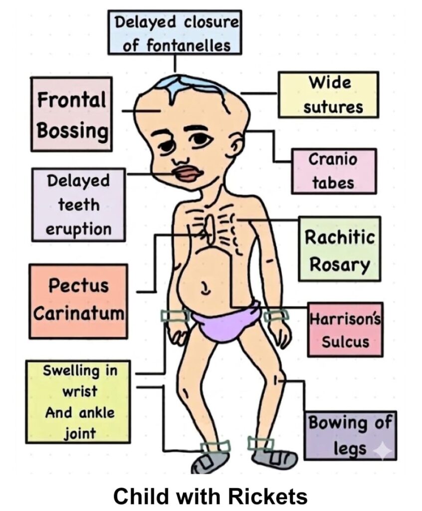 In children, as the bones are still growing, we observe rickets, a disease where only the cartilage-like foundation for the bone is formed, without any calcium salts getting deposited on it, which is like the bone’s cement. As a result the legs bow unable to bear the body weight, and the knees knock each other while walking. Children also suffer from delayed teeth eruption and weak teeth, bead – like swellings on either sides of the breast bone (rachitic rosary), the depression below the lower most rib becoming very prominent (Harrison’s sulcus), softening of the skull bones (craniotabes) and protruding breast bone (Pectus carinatum) . They may also become irritable and refuse to feed.