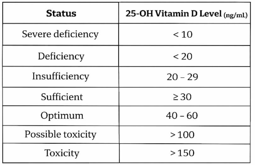 As the saying goes, to understand what is abnormal, we must first understand what is normal. When it comes to vitamin D, doctors measure the level of 25-hydroxyvitamin D (25-OH vitamin D) in the blood. This form, also called calcidiol, is the most stable and abundant storage form in the body, making it the best indicator of overall vitamin D status. As per the Indian Council of Medical Research (ICMR), the following table gives the reference levels of vitamin D accepted by clinicians in India: