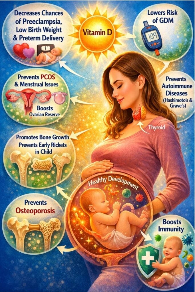 During pregnancy, it has been proven that complications like gestational diabetes mellitus (GDM), preeclampsia, post partum hemorrhage (PPH) and low birth weight are higher in women with low vitamin D levels. Optimum vitamin D in the mother also ensures proper bone development in the fetus, decreases the risk of infections immediately after birth and chances of development of rickets in the stages of early childhood.