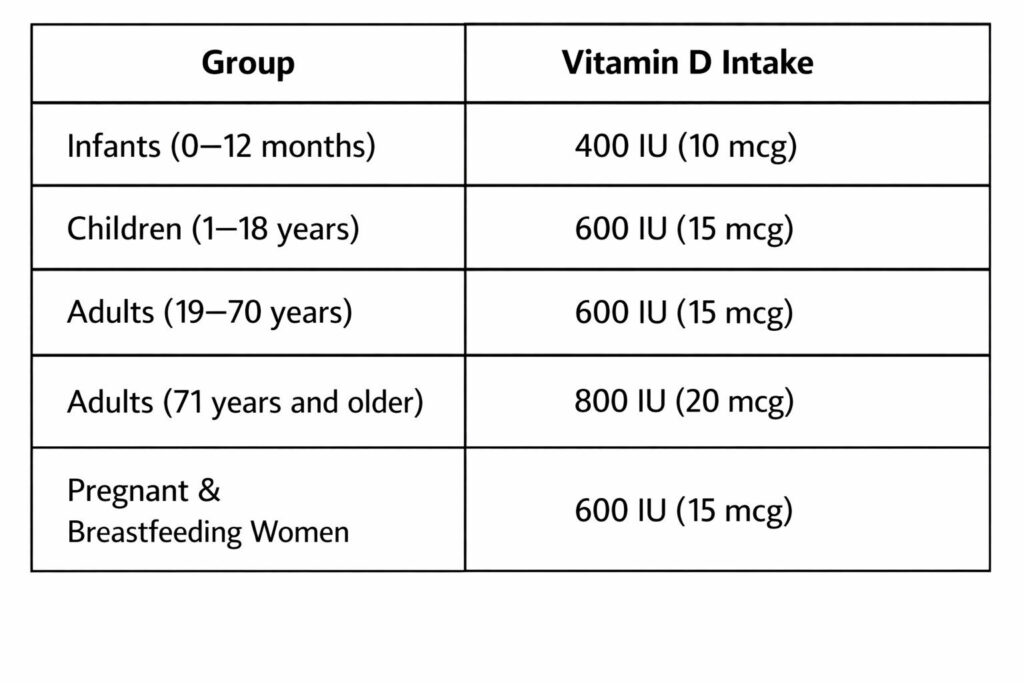 - Consumption of vitamin D–rich foods: For vegetarians, this includes 1–2 glasses of milk daily, 1 cup of fortified yogurt or paneer, and fortified mushrooms when possible. For non-vegetarians, fatty fish like salmon and mackerel (2–3 times a week) and 2–3 eggs per day are good sources. However, a diet alone without sunlight is usually insufficient, and such diets may not be feasible for everyone. The following table shows the recommended daily allowance of vitamin D in different age groups: