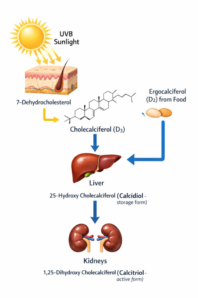 Did you know that vitamin D is not strictly a vitamin at all? It does not necessarily have to come from our diet. In the skin, exposure to adequate UV rays converts an intermediate of cholesterol production (called 7-dehydrocholesterol) into an unstable compound that quickly changes its structure to form cholecalciferol — Vitamin D in its storage form. After this, through activation in the liver and kidneys, it is converted into calcitriol (Vitamin D₃), the active form in the body.